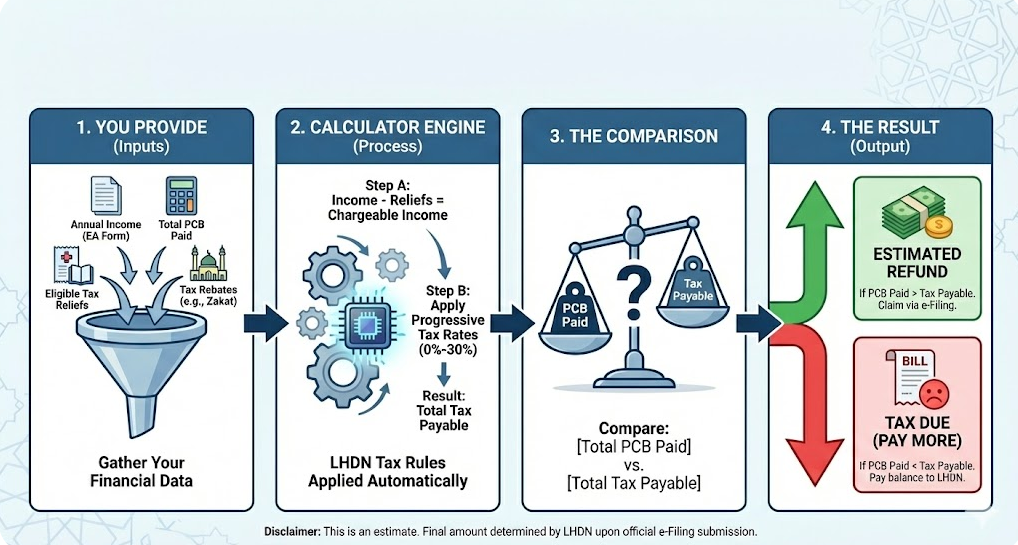 Disclaimer: Estimates only. If PCB paid > Actual Tax, you are eligible for a refund. If PCB < Tax, you must pay the balance.